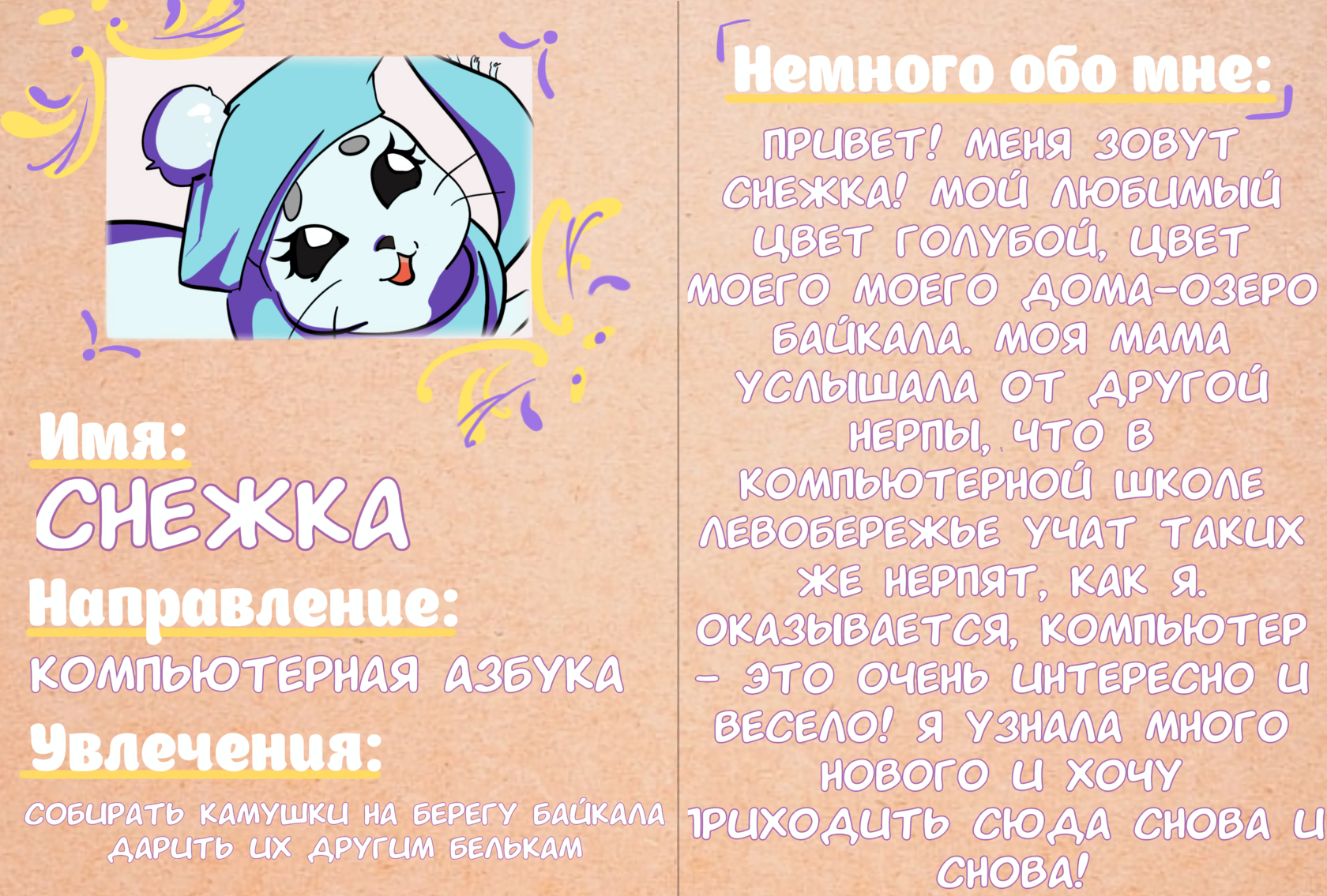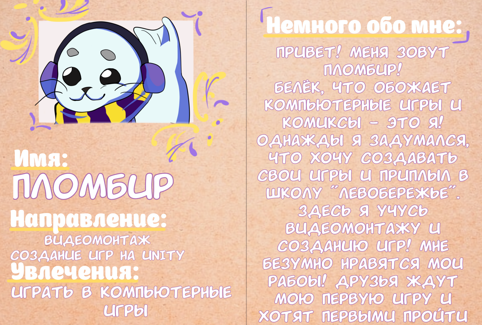 ✨ Нерпята — наши милые симпатичные талисманы— в полосатых фиолетово желтых шарфиках и с наушниками на голове Ребята сами дали им имена: Пломбир – придумала Марина Чердакова (Компьютерная азбука)